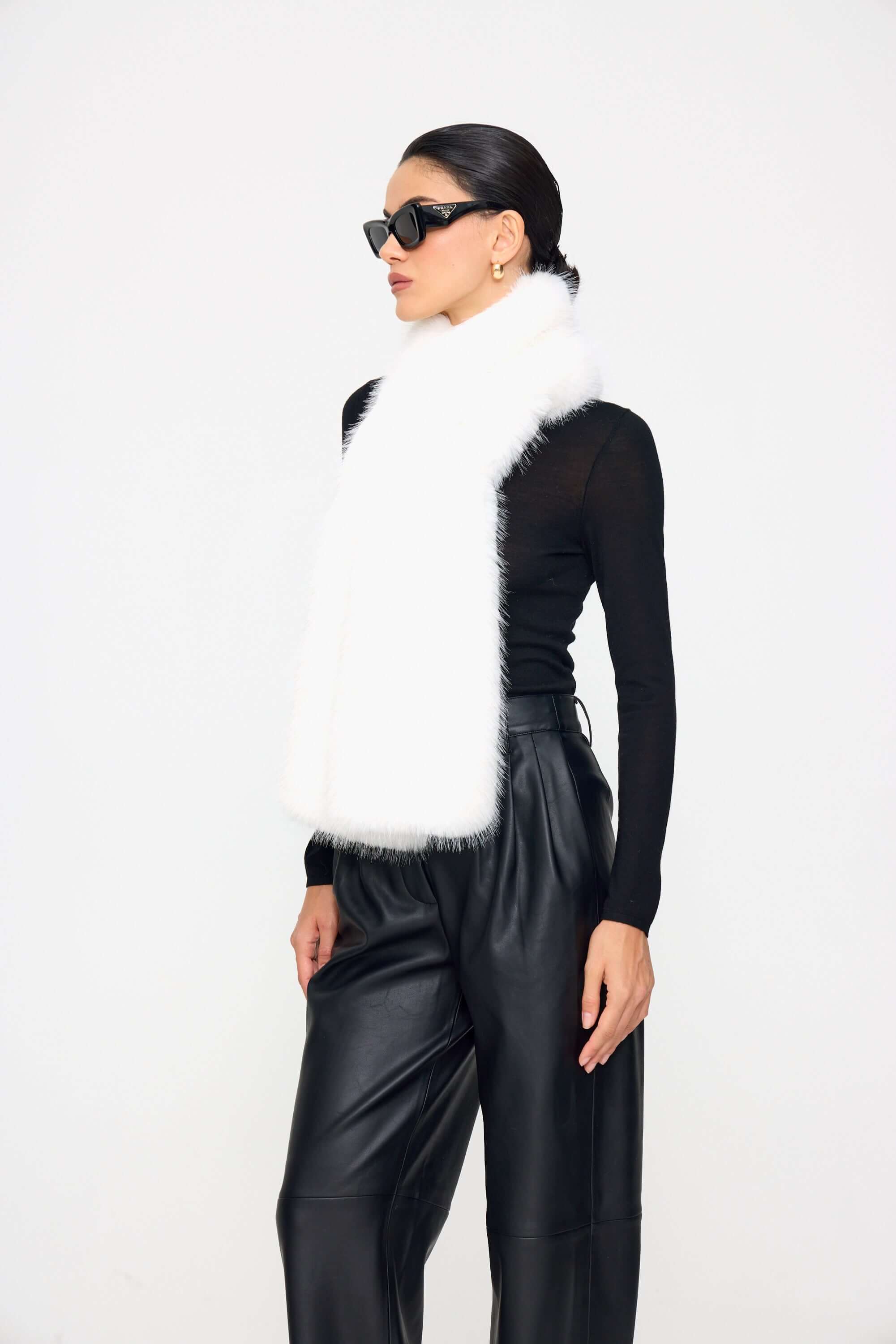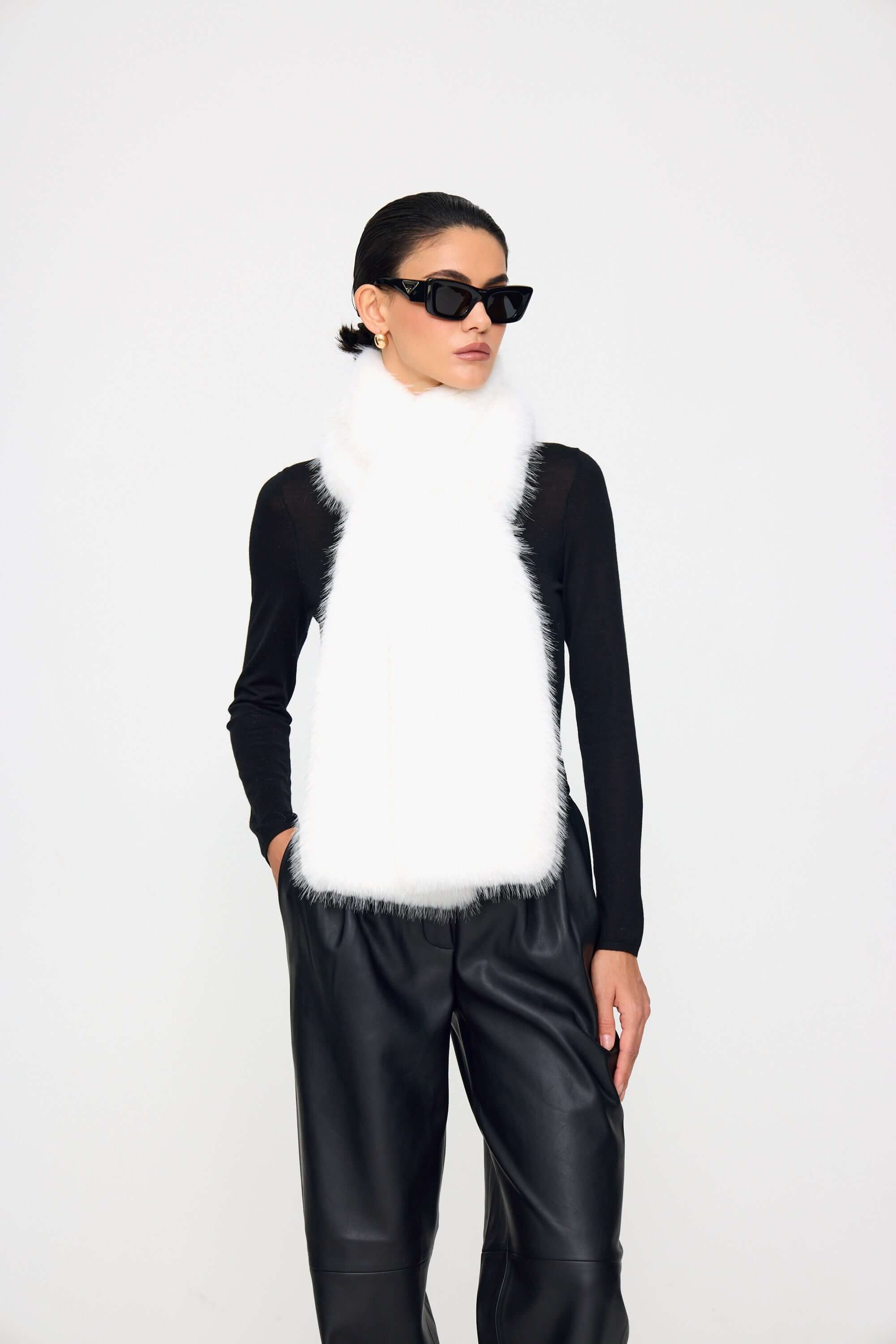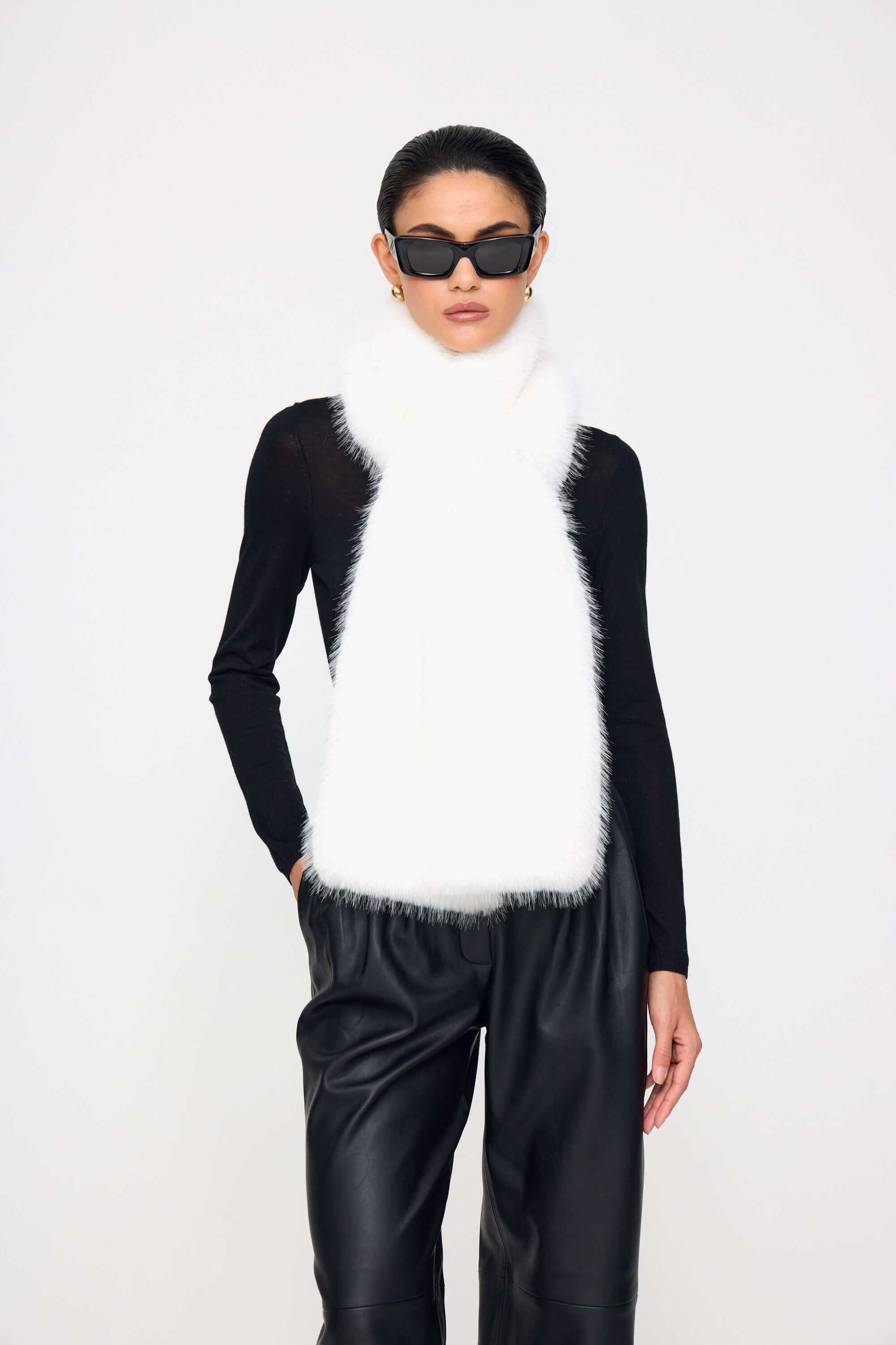 Langer weißer Schal aus hochwertigem Schneehasenfell mit Schlitz am Schalende.