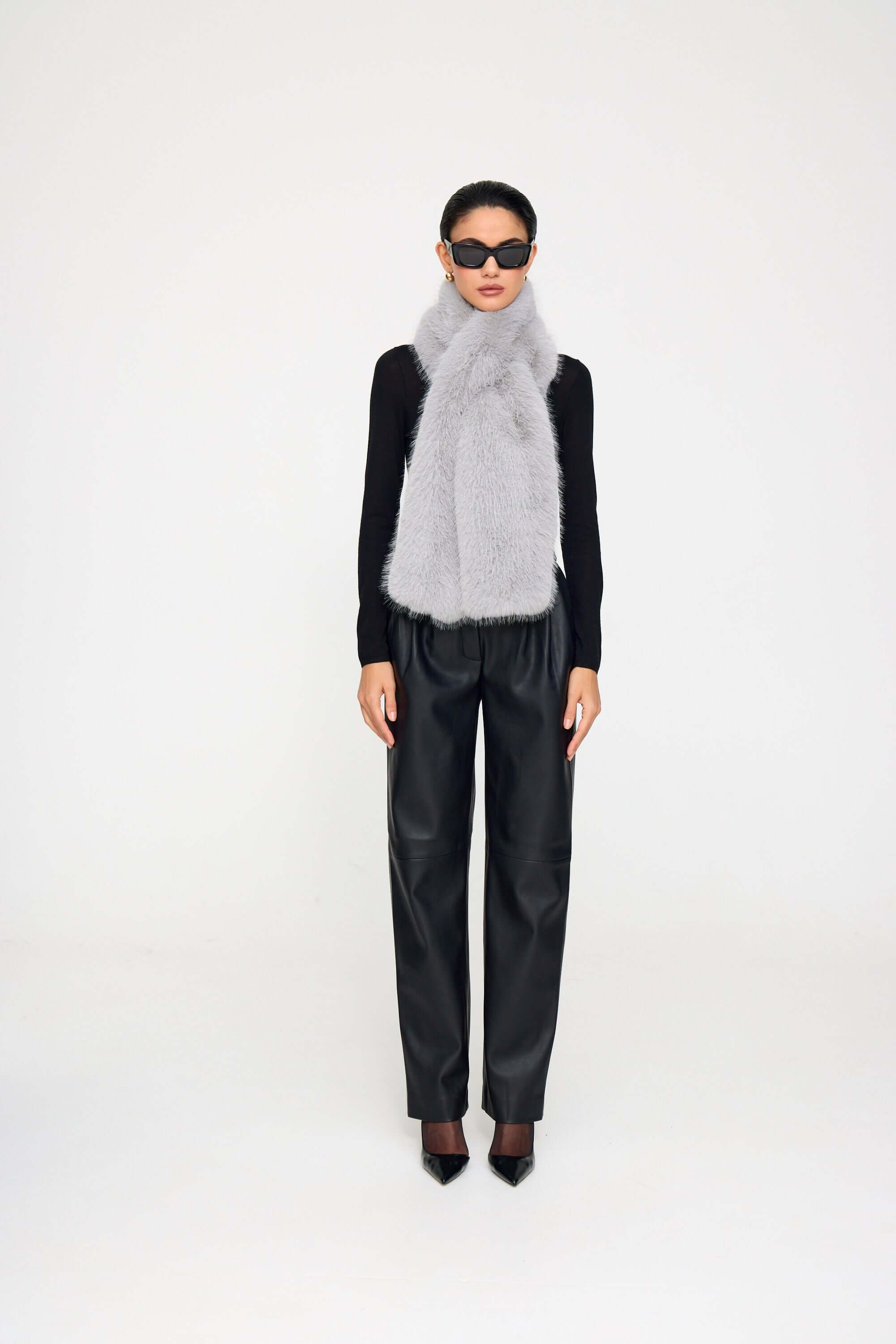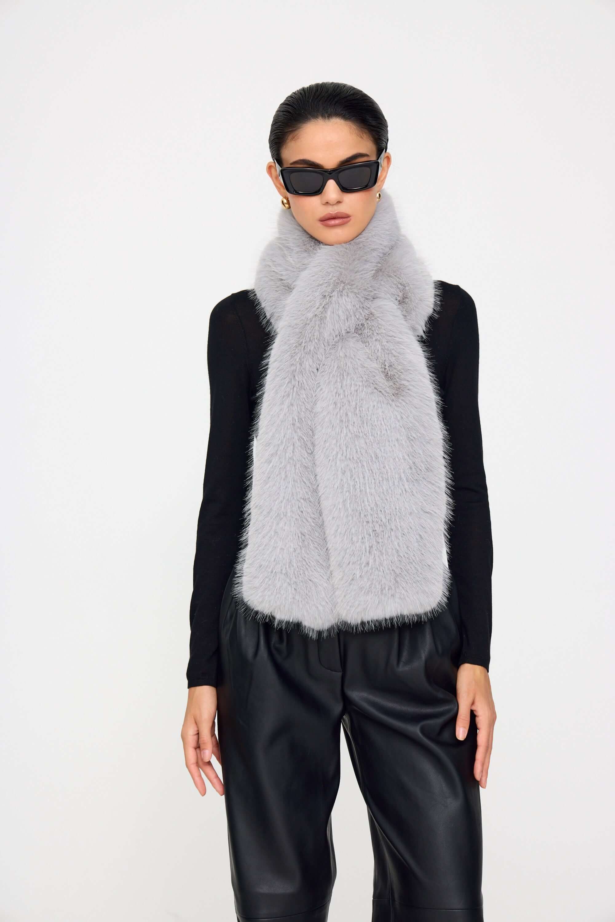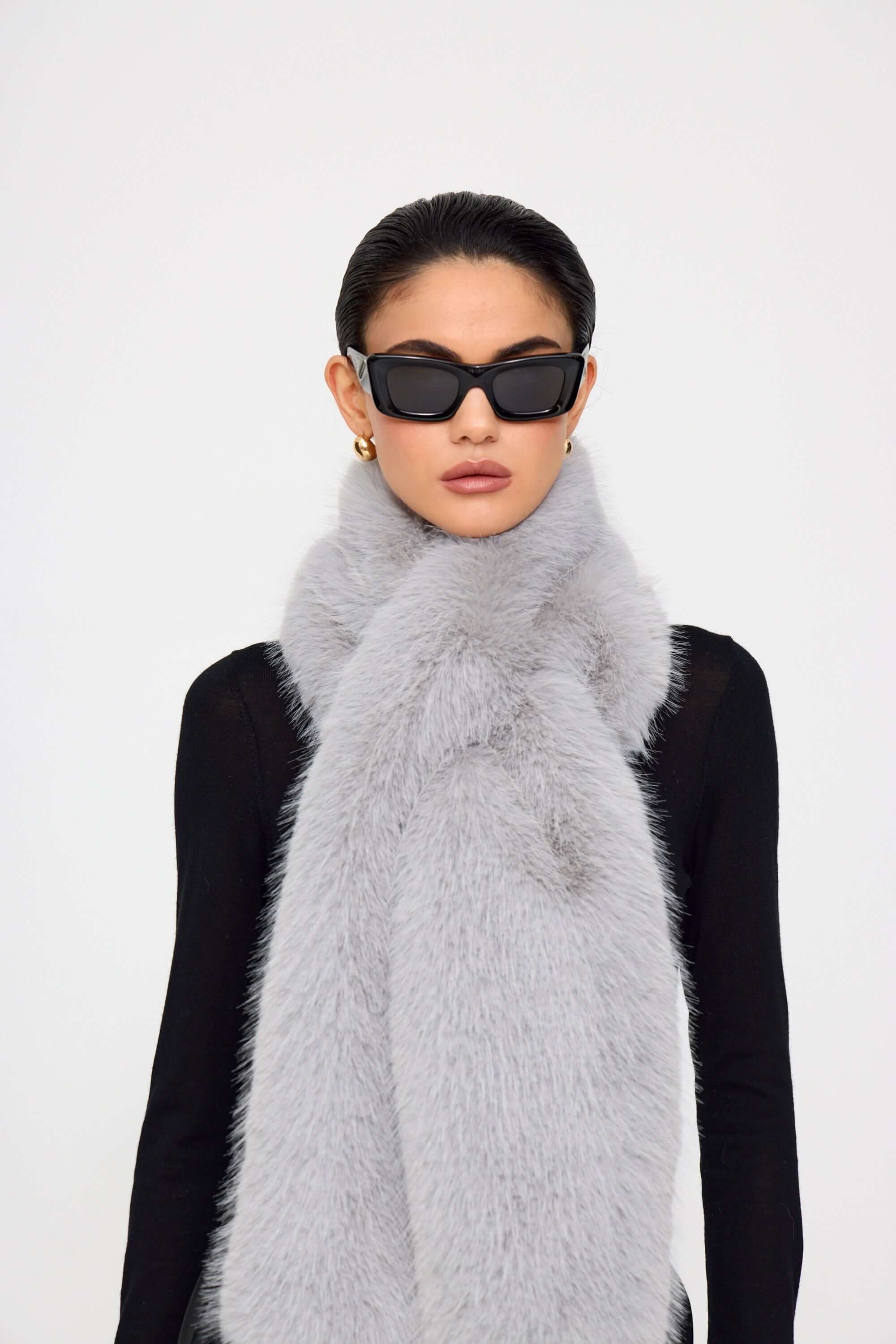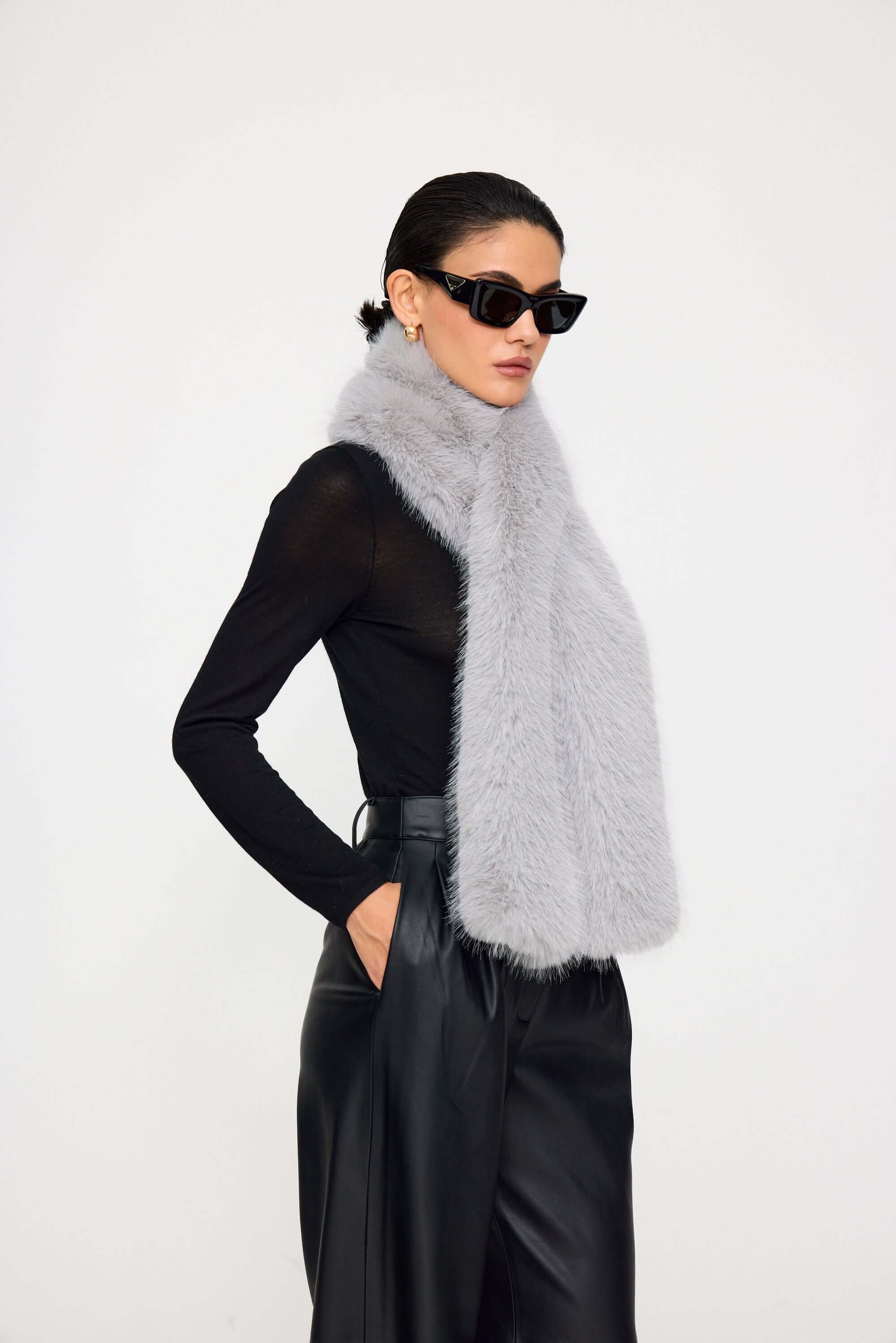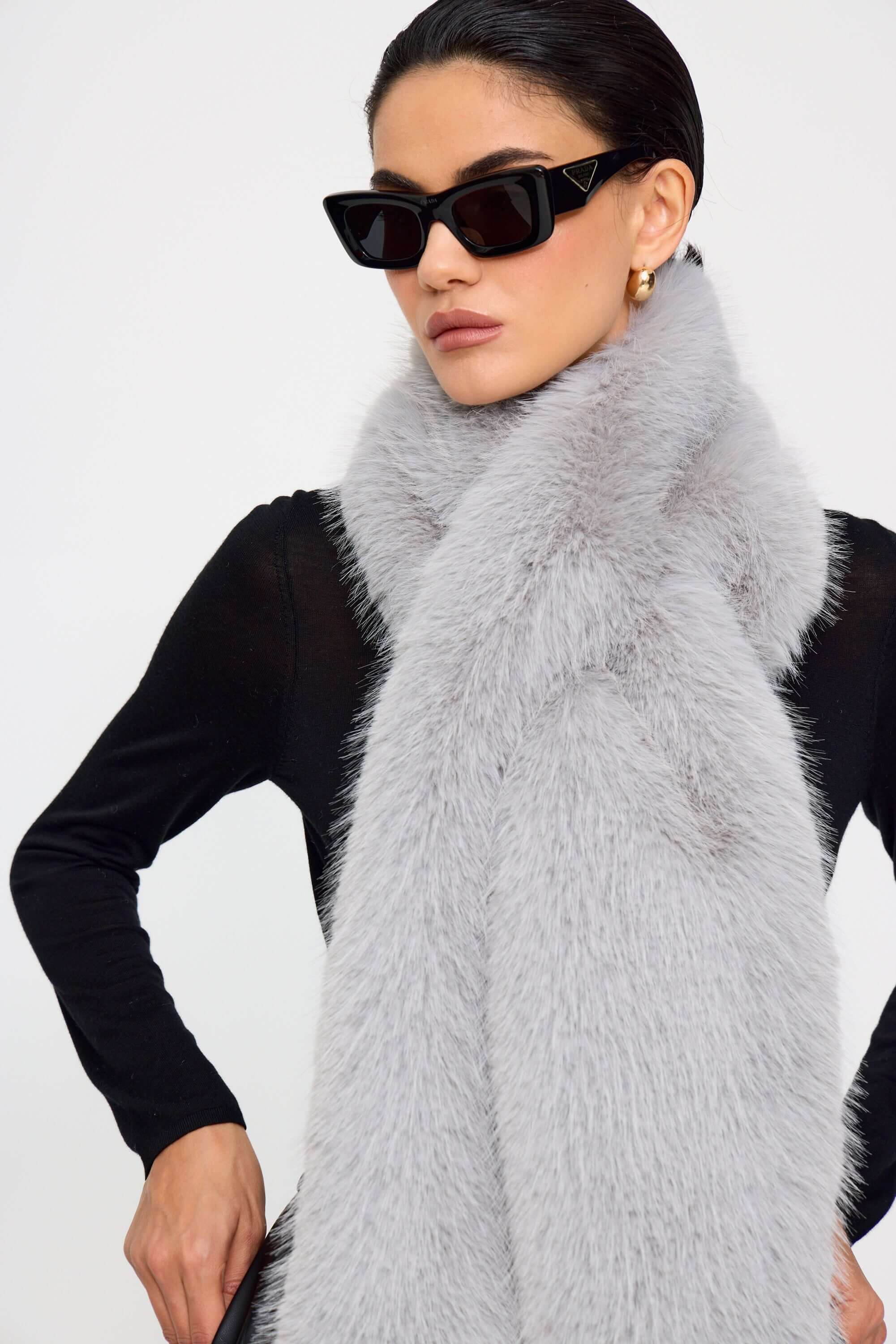 Long gray scarf crafted from premium snow hare fur with split for scarf end.