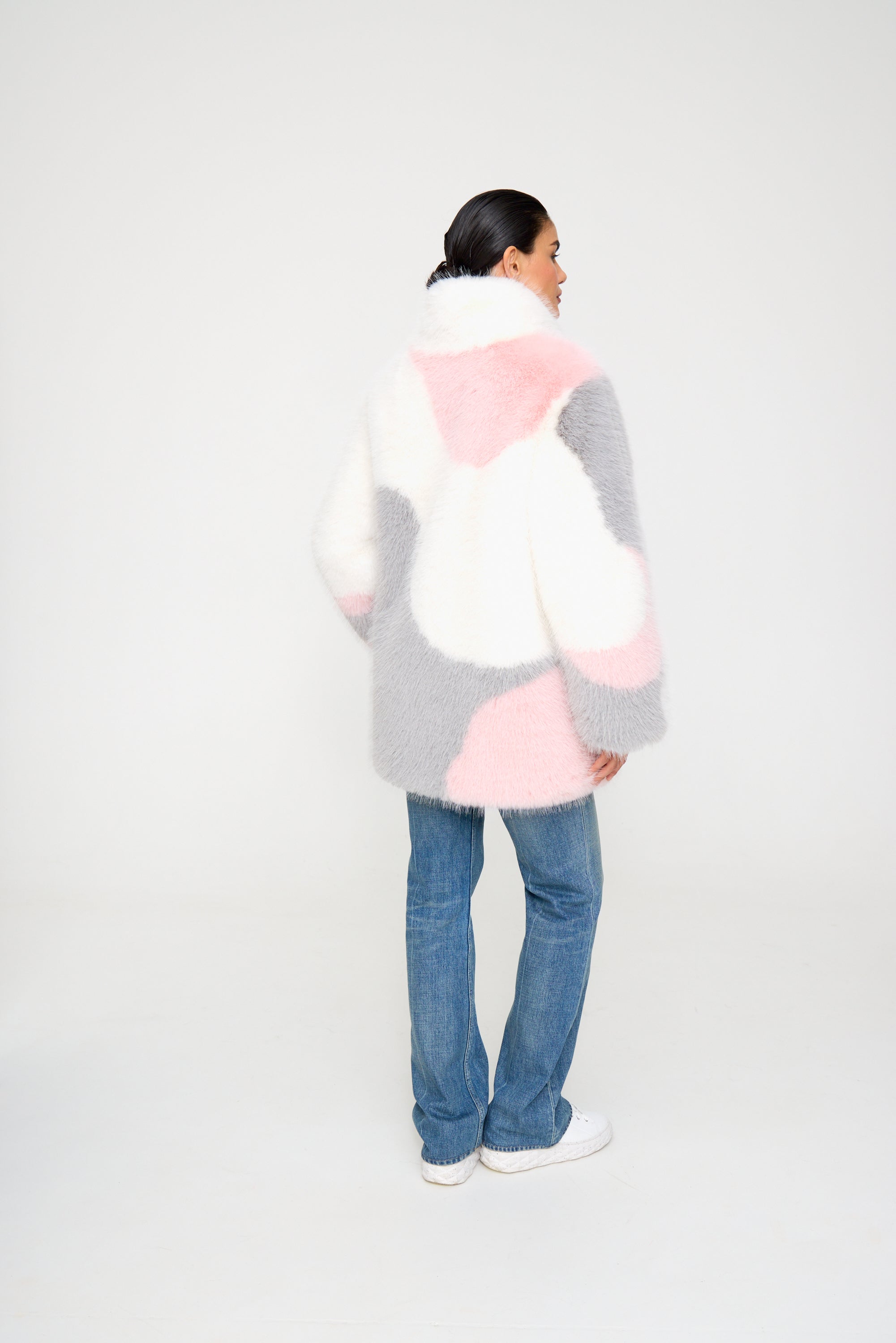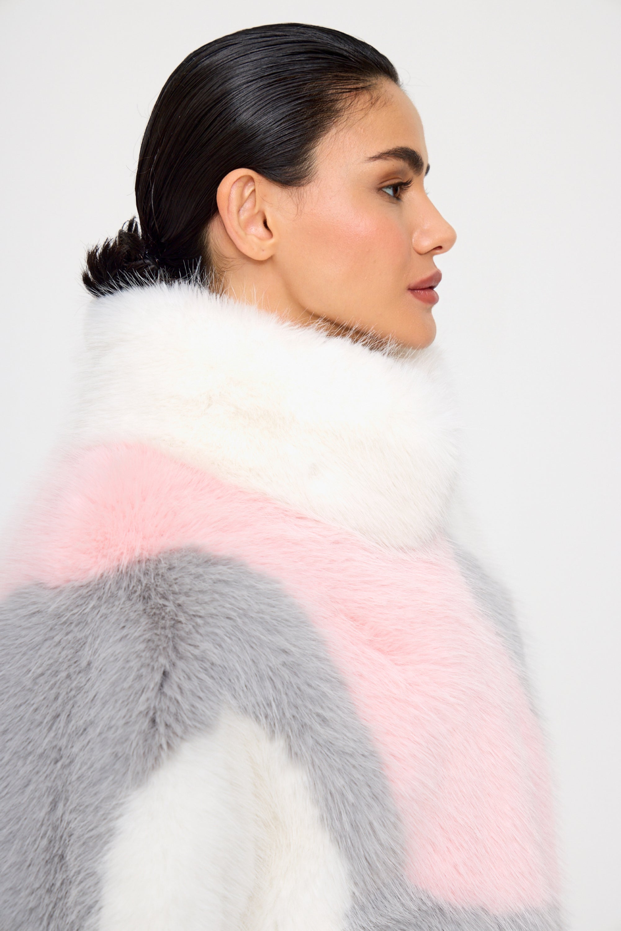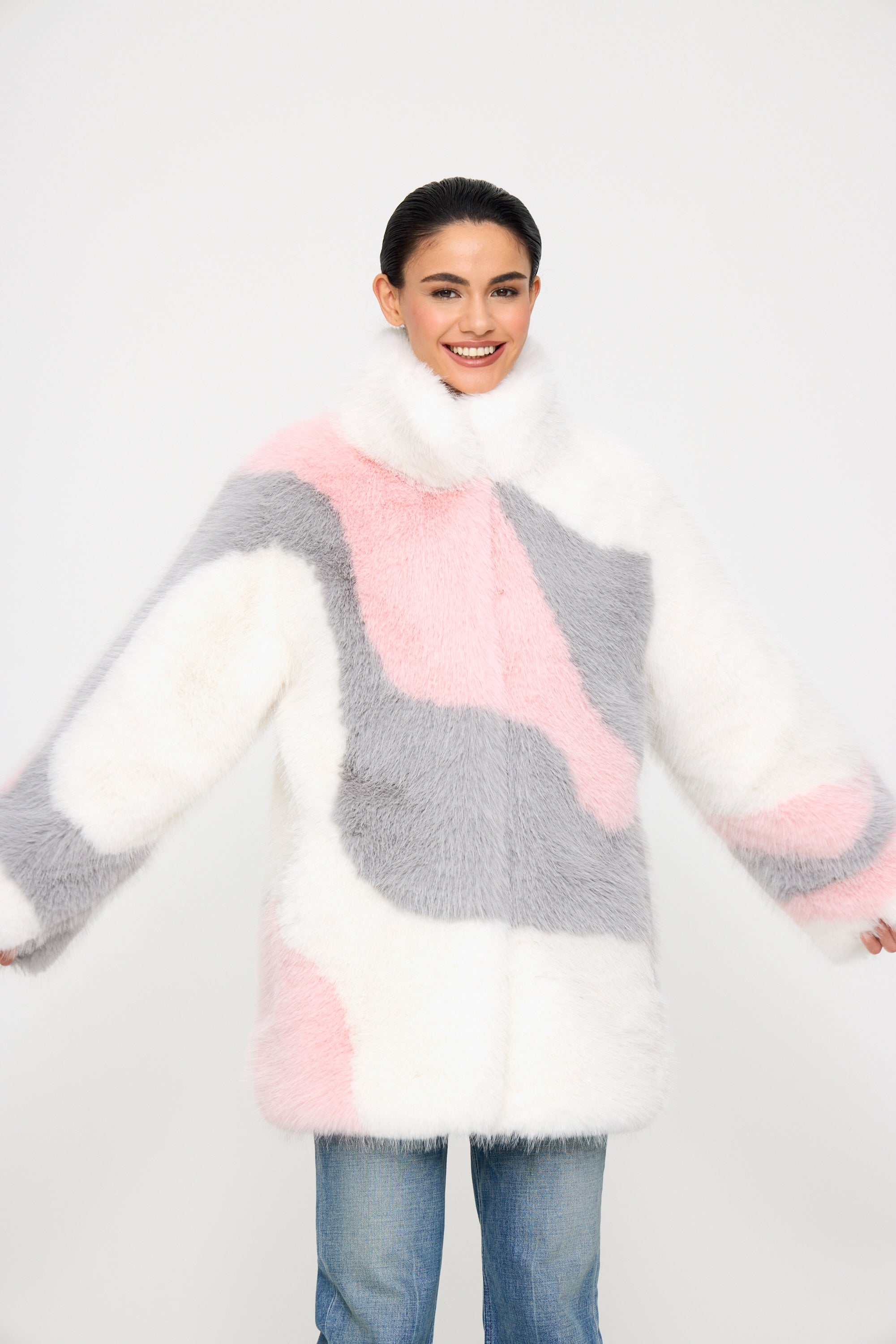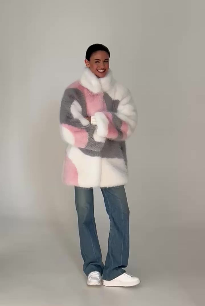 Samantha is lightweight and warm premium faux fur coat, crafted from the softest snow hare faux fur. Its unique three-tone design in white, blush pink, and grey creates an eye-catching, elegant look. Effortlessly comfortable and luxuriously soft — once you put it on, you’ll never want to take it off.